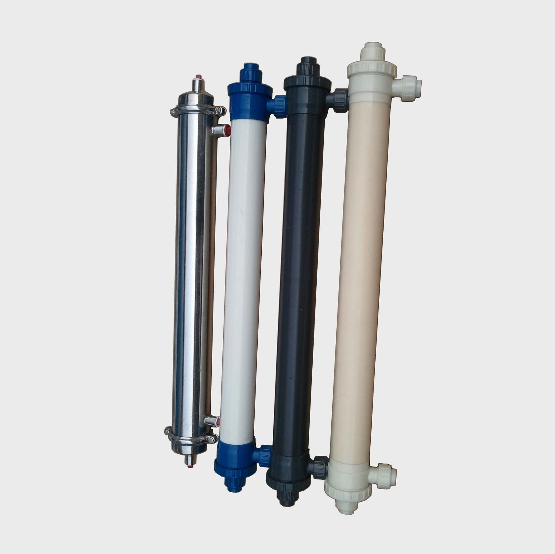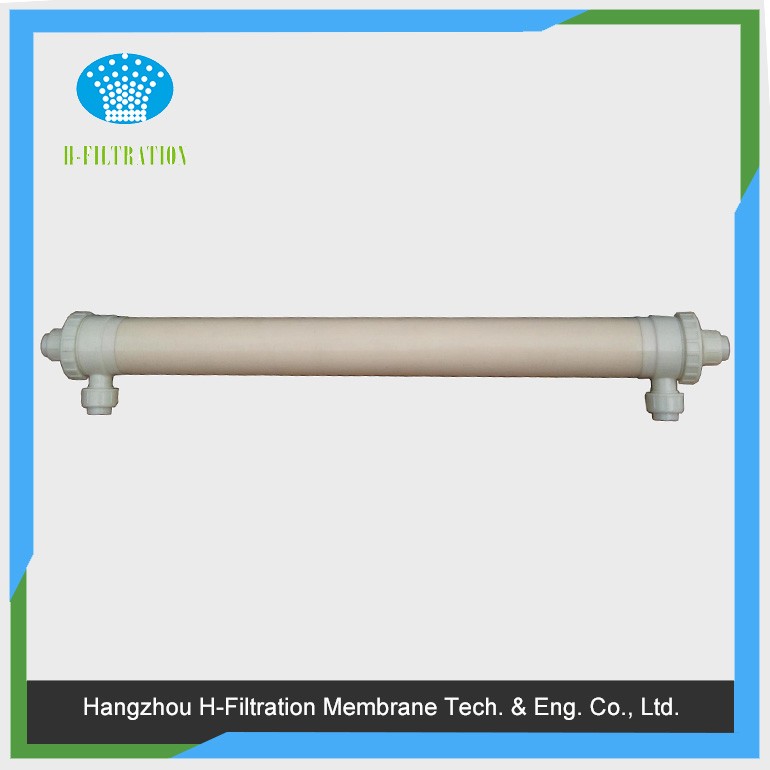 本產品為外壓式超濾膜,根據膜組件外壁的箭頭方向, 箭頭指向的端口是超濾透過液出液口,下部是電泳漆原液進液口,側面上面的口為電泳漆回流口,側面下面的口可以堵住不用;在電泳漆使用過程中可以使用水沖洗,超濾透過液沖洗,沖洗時從膜的回流口進入,原液進入口排出即可。當沖洗效果不是很好時,可以用有機酸和溶劑浸泡,循環沖洗清除膜中的油漆,從面恢復膜的通量。